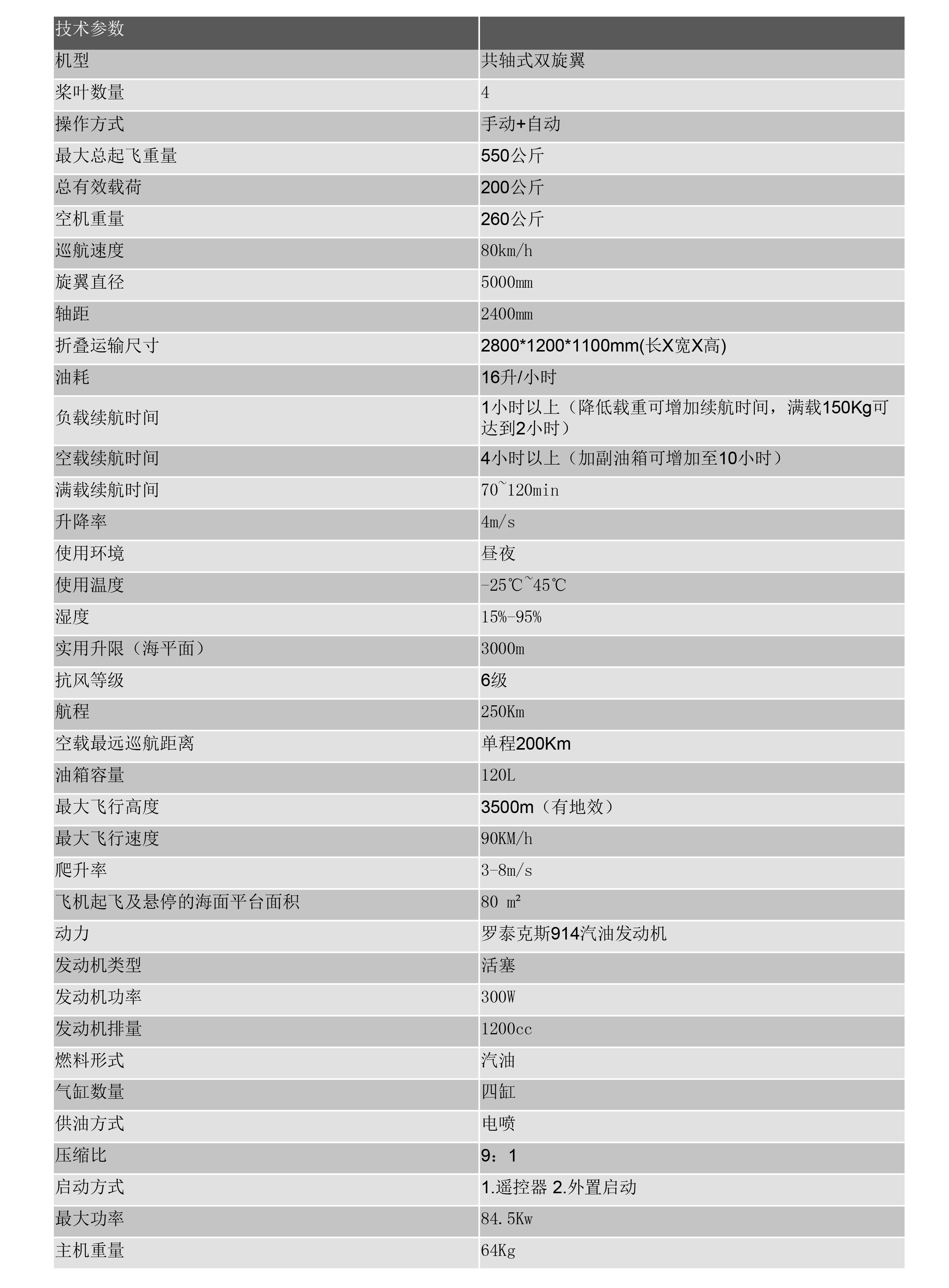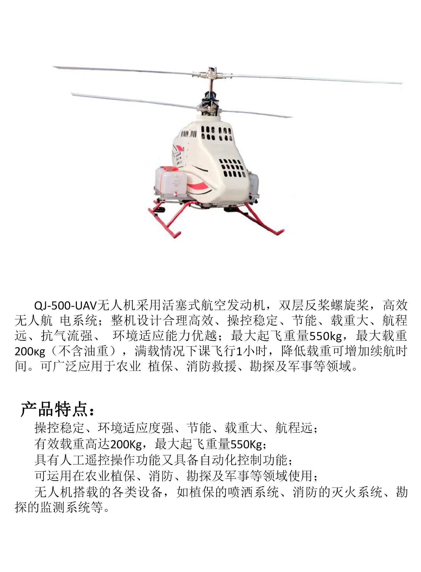 Adopting piston type aircraft engines, double-layer anti propeller propellers, and efficient unmanned avionics systems; The overall design of the machine is reasonable and efficient, with stable operation, energy saving, heavy load capacity, long range, strong resistance to airflow, and superior environmental adaptability; The maximum takeoff weight is 550kg, and the maximum load capacity is 200kg (excluding oil weight). When fully loaded, the flight will last for 1 hour after class. Reducing the load capacity can increase the endurance time. It can be widely applied in fields such as agricultural plant protection, fire rescue, exploration, and military.